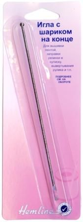 Игла с шариком на конце для вдевания резинки, косой бейки, ленты в разные элементы одежды. Применение иглы с шариком на конце: косая бейка: ввести иглу внутрь рулика шариковым концом вперед так, чтобы ушко иглы оказалось на уровне открытого края. Вставить конец рулика в ушко иглы (при необходимости закрепить его 1-2 сетжками). Проводя иглу внутри рулика, вывернуть его на лицо. резинка: вставить резинку в ушко иглы. Продвигая иглу вкулиске, вставить резину. Закрепить концы резинки. лента: вставить ленту в ушко иглы. Проводить ленту сквозь основу при помощи шарика на конце иглы.