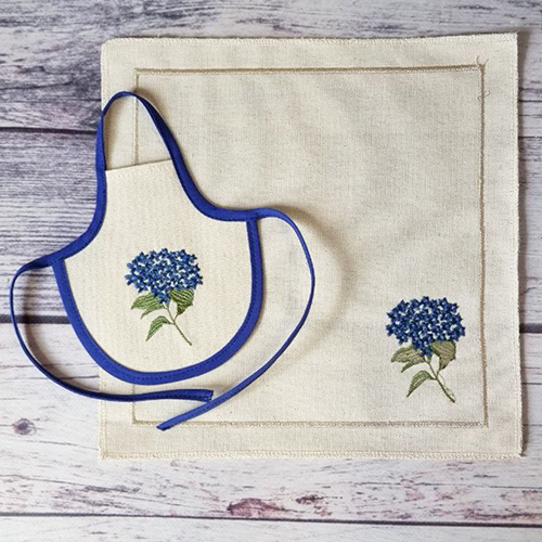 Кухонний комплект з вишивкою серветка та фартух на пляшку Гортензія синя.