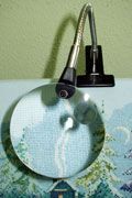 Лупа з кріпленням до столу. Завдяки металевій гнучкій трубці, яку легко можна скрутити під будь-яким кутом, лупа підходить для різних задач користувача.