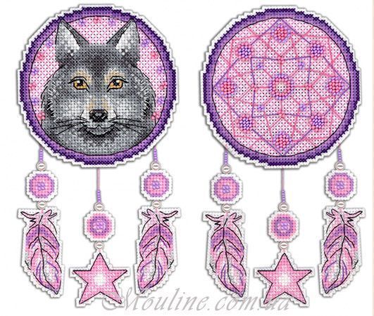 Сначала вышиваются обе стороны ловца снов (включая крестики, полукрестики, бисер и бусины), затем острыми ножницами вышивка вырезается по контуру и две стороны сшиваются изнанкой внутрь. Вся необходимая информация по ходу работы представлена в инструкции.