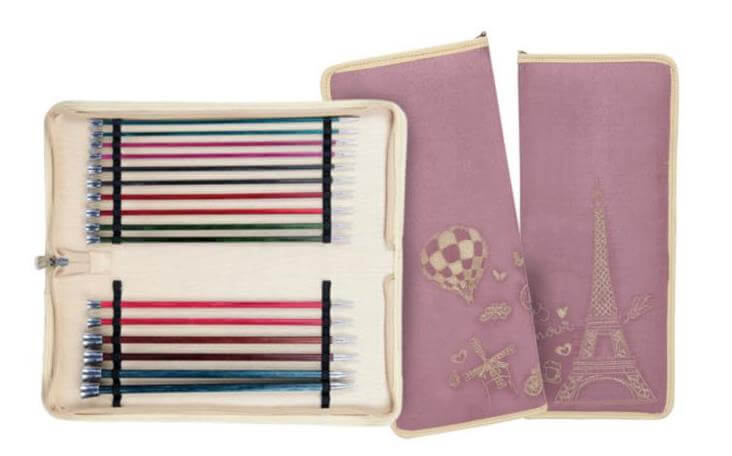 Цветные деревянные спицы из березы с блестящими металлическими наконечниками от всемирно известного бренда KnitPro. Редкая комбинация прочности и утонченности. Каждому размеру спиц соответствует свой цвет для легкой идентификации номера спицы. Блестящий и гладкий наконечник. Прекрасно зауженные наконечники идеально подходят для всех типов пряжи. Легкие, прочные спицы Royale KnitPro обладают долгим сроком службы. Полированная деревянная поверхность работает легко с каждым типом п ряжи, не замедляя вяжущий ритм. Просты в использовании и идеально подходят для новичков. Спицы Royale KnitPro обеспечат радостные часы вязания без всякой усталости. В набор входит 8 пар спиц: 3.50 мм - аквамарин, 4.00 мм - фуксия, 4.50 мм - серый, 5.00 мм - вишня, 5.50 мм - темно-зеленый, 6.00 мм - розовый, 7.00 мм - бордовый, 8.00 мм - синий. Набор упакован в тканевой чехол с вышитым рисунком в стиле "Париж".